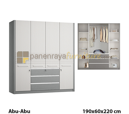 - Lemari terbuat dari particleboard dan MDF finishing pvc vacum warna abu-abu serat doff.