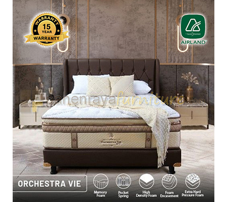 Airland Orchestra Vie diciptakan untuk memberikan tidur yang menyenangkan. Kemewahan Orchestra Vie terdiri dari lapisan Plush Top yang lembut dan nyaman, pembungkus kasur yang diisi dengan dacron, serta berlapis-lapis natural latex dan memory foam. Ditambah lagi dengan kain kasur yang terbuat dari bahan Sutra yang secara alami menyesuaikan dengan suhu tubuh, serta bahan Argentum yang hypoallergenic dan mengurangi perkembangbiakan bakteri.